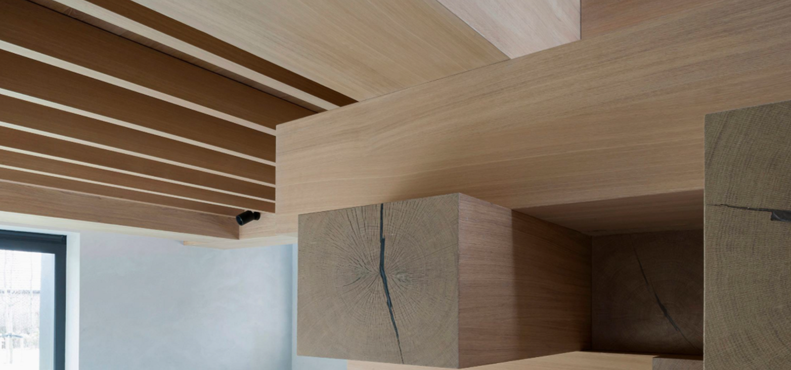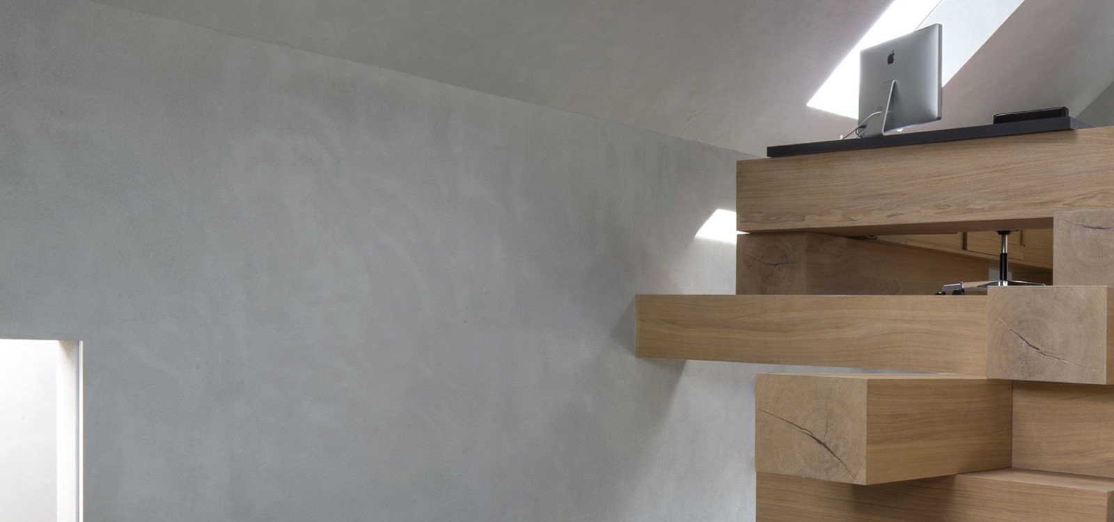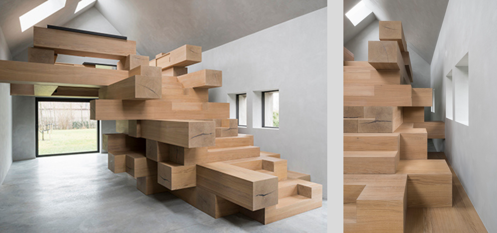 In samenwerking met Studio Farris architecten, wonnen we de “best home office award”. Gemaakt van houten balken en gestapeld in afwisselende hoeken, creëert het ongebruikelijke volume een verscheidenheid aan functionele ruimtes voor de eigenaar, die de stal wilde transformeren in zijn thuiskantoor. De gelaagde balken kunnen als een trap gebruikt worden en leiden naar een bovenverdieping die groot genoeg is voor twee bureaus