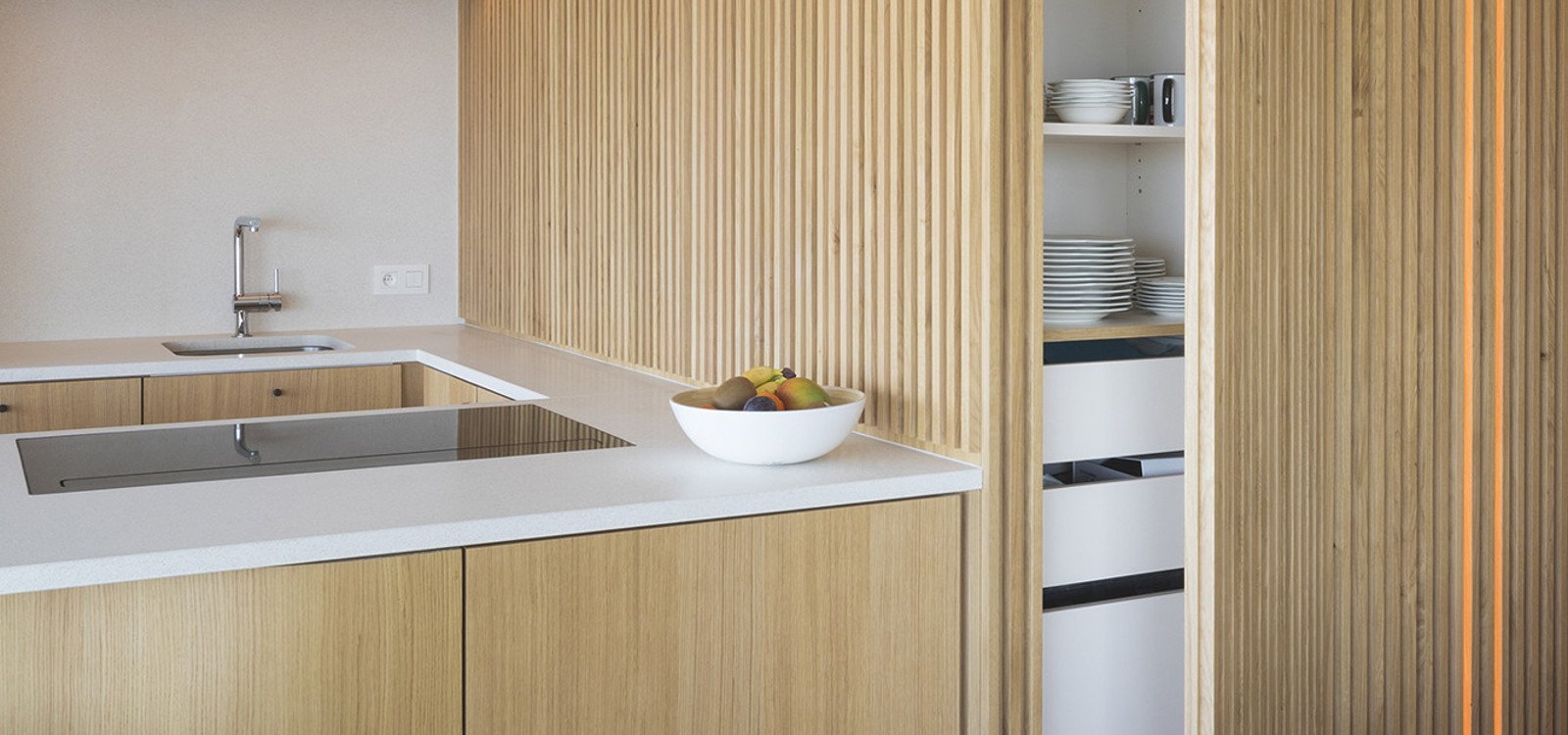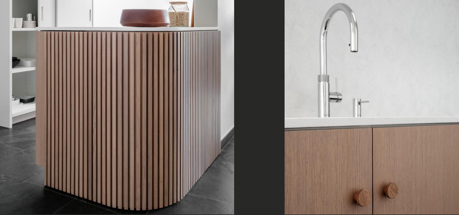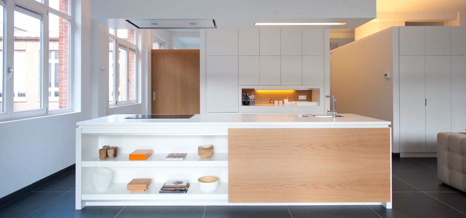 Het natuurlijk eikenhout brengt warmte en diepte in dit nieuwe keukenproject, terwijl strakke witte oppervlakken een minimalistische achtergrond creëren. Deze keuken bevat subtiele accenten en technieken, zoals de verschillende grepen, het verticale effect in zowel de keuken als de tafel en de zwevende bank.