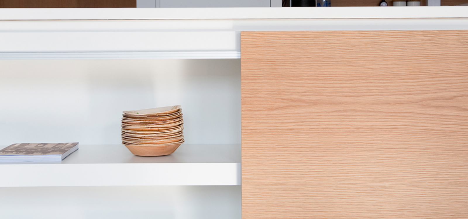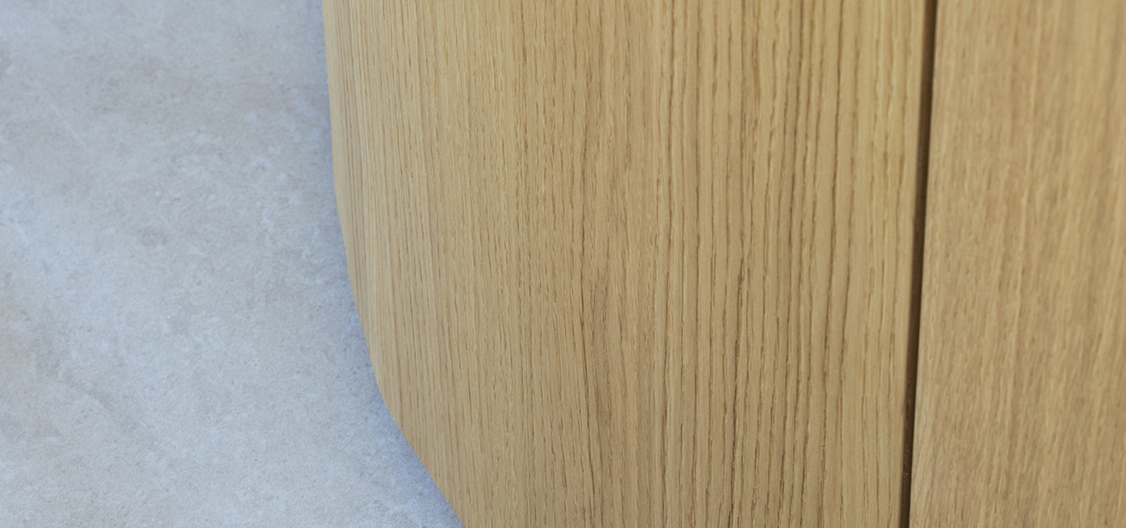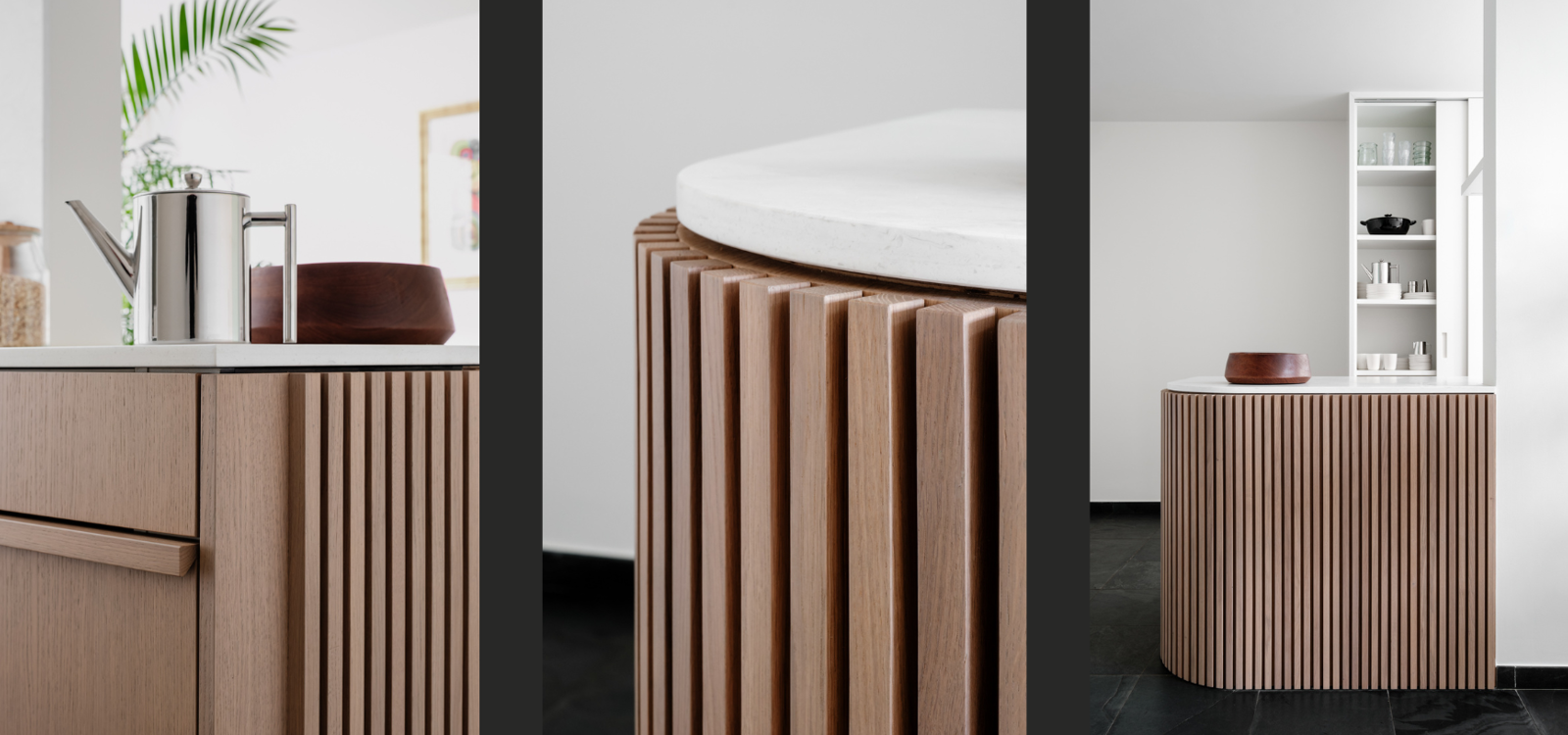 Het natuurlijk eikenhout brengt warmte en diepte in dit nieuwe keukenproject, terwijl strakke witte oppervlakken een minimalistische achtergrond creëren. Deze keuken bevat subtiele accenten en technieken, zoals de verschillende grepen, het verticale effect in zowel de keuken als de tafel en de zwevende bank.