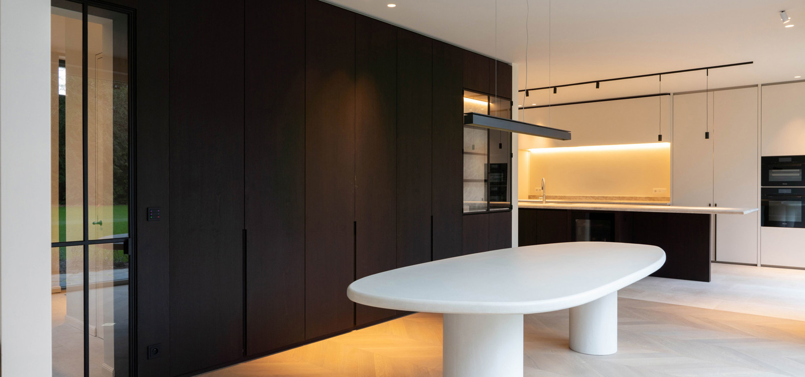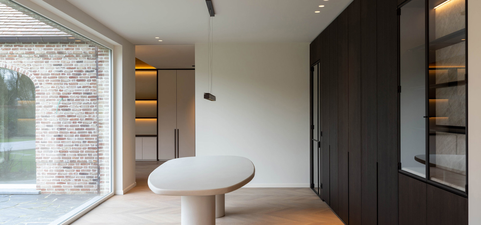 Voor het project Legrelle - Frilling in Brasschaat werkte architect Gilles Van Houcke in samenwerking met Vooruitzicht Interiors aan een volledig op maat gemaakt interieur. Elke ruimte in de woning – van keuken en badkamers tot slaapkamers, dressing en leefruimtes – werd tot in de puntjes uitgewerkt. Het resultaat is een harmonieus en hoogstaand interieurconcept waarin comfort, functionaliteit en esthetiek naadloos samenkomen.